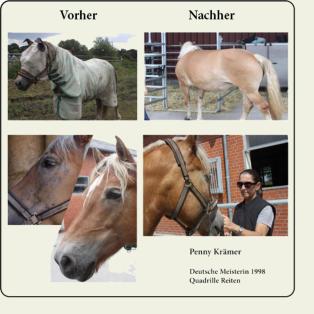 Zu Beginn der 360° Sommerekzem-Methode hatte Amelie eine starke Scheuerneigung, starke Scheuerstellen an Kopf, Mähne, Bauchnaht und Ohren. Sie musste ganztägig eine Ekzemdecke tragen. Bisher durchgeführte Maßnahmen hatten wenig bis keinen Erfolg. Schon nach 14 Tagen zeigten sich deutliche Verbesserungen. Das Verhalten änderte sich von unruhig auf ruhig, die z.T. offenen Scheuerstellen begannen zu heilen. Nach 4 Wochen konnte die Ekzemdecke nachts abgenommen werden, die Scheuerneigung nahm deutlich ab. Nach 6 Wochen war alles verheilt, Amelie trägt die Ekzemdecke nur noch wenige Stunden am Nachmittag. Jetzt, nach 8 Wochen, benötigt Amelie keine Ekzemdecke mehr! Penny Krämer: Amelie ist ein Schul- und Lehrpferd, musste 24 Stunden mit einer festen Ekzemdecke einschließlich Kopfhaube eingedeckt sein. Zu Beginn des Tests war ich skeptisch, zumal die unterschiedlichsten Mittel bisher wenig bewirkt hatten. Ich war umso überraschter, als sich schon nach kurzer Zeit die ersten Erfolge einstellten. Nach 6 Wochen waren die Scheuerstellen verheilt, Amelie verhielt sich ruhig und entspannt. Jetzt, nach 8 Wochen, benötigt Amelie keine Ekzemdecke mehr, was im Schulbetrieb eine erhebliche Erleichterung ist. Penny Krämer ist Deutsche Meisterin 1998 im Quadrille Reiten.