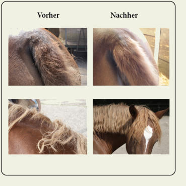 Amy hatte eine starke Scheuerneigung, Gesicht, Ohren, Mähnenkamm und Schweifrübe waren stark befallen. Die Scheuerneigung war extrem, nur mit einer ganztägig zu tragenden Ekzemdecke konnte die Situation erträglich gehalten werden. Schon nach nur einer Woche traten die ersten deutlichen Verbesserungen ein, nach 14 Tagen die ersten Stunden ohne Ekzemdecke.Jetzt nach 6 Wochen ist alles abgeheilt und Amy benötigt keine Ekzemdecke mehr. Die Scheuerneigung ist reduziert auf das normale Maß eines jeden Pferdes. Die Haare und das Fell wachsen wieder. Carem Müller: Amy hat jedes Jahr äußerst stark mit dem Sommerekzem zu kämpfen. Etliche einschlägige Mittel wurden probiert, jedoch hatte keines eine durchschlagende Wirkung. Ohne Ekzemdecke ging nichts.Umso erstaunlicher war es, dass Amy sich schon nach kurzer Zeit nicht mehr „schubberte“, die Stirn total ausheilte, sich am Mähnenkamm und an der Schweifrübe neue Haare bildeten. Jetzt, nach nur 6 Wochen, benötigt sie keine Ekzemdecke mehr, sie ist ein „ganz normales Pferd“. Carem Müller betreibt zusammen mit ihrem Mann einen Reiterhof im Kreis Storman, Schleswig-Holstein.